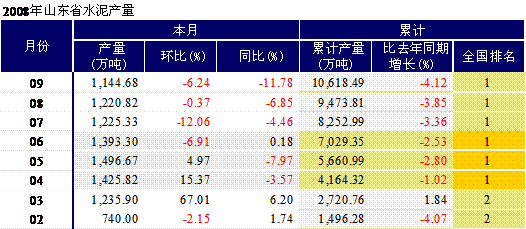 山東省一直是全國水泥的產(chǎn)量大省,但自今年年初以來受國際、國內經(jīng)濟影響,以及山東省建設的緩慢,山東省的水泥產(chǎn)量增速放緩,累計產(chǎn)量同比增長速度自4月份開始處于“滑鐵盧”,甚至出現(xiàn)負增長。
