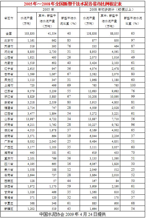 2009年4月中國水泥協(xié)會(huì)經(jīng)過與各省市自治區(qū)協(xié)會(huì)、行管辦及部分大企業(yè)逐一核對,初步完成截止2008年底,各省市自治區(qū)新型干法水泥比重表。