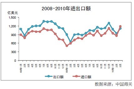 2010年第一季度進出口總額6178.5億美元,同比增長44.1%,比上年四季度加快 34.9個百分點。其中,出口3161.7億美元,增長28.7%;進口3016.8億美元,增長64.6%。進出口相抵,順差144.9億美元,比上年同期減少479億美元;其中,3月份貿易逆差72.4億美元。