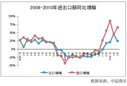 從月度同比增幅來看,2009年11月進出口額同比下降的情況得到扭轉,2010年第一季度進口額同比增幅高于出口額同比增幅。
