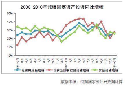 從城鎮(zhèn)固定資產投資同比增幅來看,2009年6月固定資產投資連續(xù)增長趨勢結束,開始震蕩下降。國有及國有控股投資同比增幅由2009年5月的43.7% 降至12月的20.7%,2010年1-2月提高到27.4%;其他投資同比增幅由2009年5月的35.2%震蕩下降至11月的20.6%,2010年 1-2月達到26.1%。