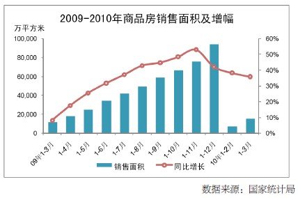 2010年第一季度全國商品房銷售面積15361萬平方米,同比增長35.8%,增幅比去年全年回落6.3個百分點。其中,商品住宅銷售面積增長34.2%。