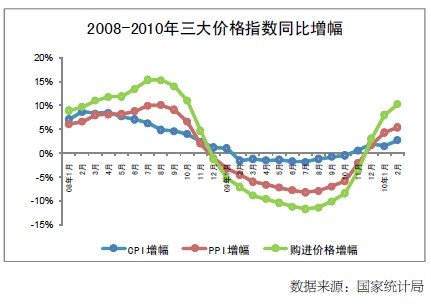 2010年第一季度CPI、PPI、原材料、燃料和動力購進價格指數分別為2.2%、 5.2%、9.9%。從月度數據來看,2009年11月CPI同比漲幅由負轉正,當月上漲0.6%,2010年2月上漲2.7%;2009年12月PPI 由負轉正,當月上漲1.7%;原材料、燃料和動力購進價格指數由負轉正,當月上漲3.0%。2009年12月至2010年3月三大價格指數連續(xù)同比增長四個月,通脹需引起高度重視。