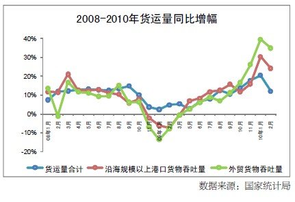 全社會貨運量從貨物運輸層面反映經濟運行情況。2009年貨運量合計數、沿海規(guī)模以上港口貨物吞吐量、外貿貨物吞吐量同比增幅連續(xù)提高,貨運量指標回暖態(tài)勢進一步鞏固。2010年1月同比增幅進一步提高,貨運量合計數增長20.5%,沿海規(guī)模以上港口貨物吞吐量增長30.4%,外貿貨物吞吐量增長39.6%;因春節(jié)原因,2月增幅出現較大回落。