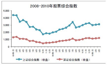 與2009年12月相比,2010年第一季度末上證綜合指數尚未恢復到同等水平,深證綜合指數略有提高。
