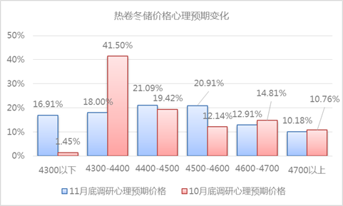 熱卷冬儲市場心態(tài)也發(fā)生了變化,相較螺紋鋼冬儲目標價位更為明確。其中價格在4300以下愿意進行冬儲的占比為16.91%,較11月初調(diào)研增15.46%;價格在4300-4400進行冬儲的占比18%,較11月初調(diào)研降23.5%;愿意在4400-4600進行冬儲的占比42%,較11月初調(diào)研增10.44個百分點;愿意在4600-4700進行冬儲的占比12.91%,較11月初調(diào)研降1.9個百分點;愿意在4700以上進行冬儲的占比10.18%,較11月初調(diào)研降0.58個百分點。