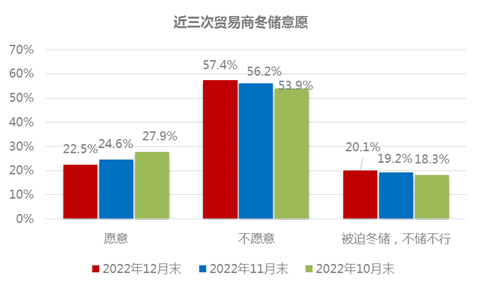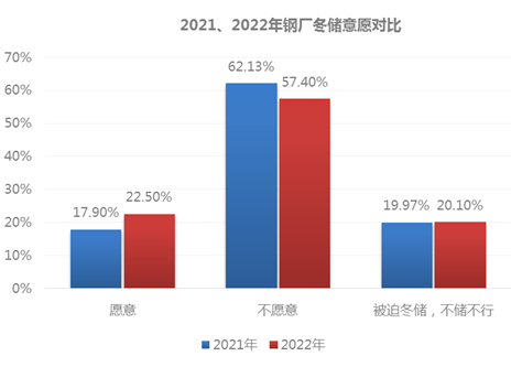 但從今年冬儲意愿和去年冬儲意愿比:2022年冬儲意愿較2021年冬儲意愿增加4.6個百分點,不愿意冬儲意愿較去年下降4.73個百分點,被迫冬儲的較去年增0.13個百分點。