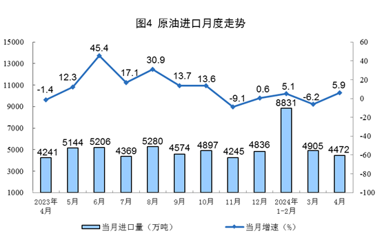 原油生產(chǎn)平穩(wěn)增長,進(jìn)口由降轉(zhuǎn)增。4月份,規(guī)上工業(yè)原油產(chǎn)量1747萬噸,同比增長1.3%,增速比3月份加快0.1個(gè)百分點(diǎn);日均產(chǎn)量58.2萬噸。進(jìn)口原油4472萬噸,同比增長5.9%。